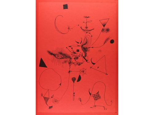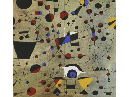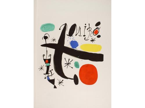 1968. LIBRO. (BIBLIOFILIA-ARTE). LES ESSÈNCIES DE LA TERRA. Barcelona: Ed. Polígrafa, 1968. Folio imperial. Extractos de textos de varios autores, entre ellos Joan Perucho y Onofré Manescal. Ilustr. con 13 litografías de Joan Miró a color y en b/n, 6 de ellas a doble p. Papel de hilo Guarro. En rama con rústica litografiada en color, cubiertas y estuche de tela editorial, también ilustradas por el artista. Edición de 1000 ejemplares con la firma manuscrita de MIRÓ.