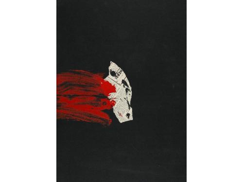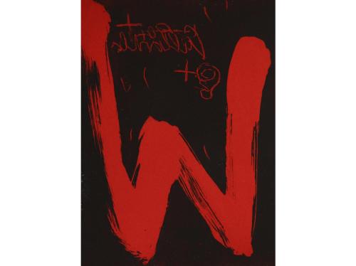 1988. LIBRO. (ARTE CONTEMPORÁNEO). CARRER DE WAGNER. Barcelona: Tip. Grafos, 1988. Gran folio. El libro contiene 10 textos de Joan Brossa, firmados y numerados a lápiz, y 10 aguafuertes de A. Tàpies, 5 de ellos sobre terciopelo en rojo y negro, también firmados y numerados por el artista. Realizado sobre papel especial de hilo, con las barbas y todo realizado bajo la dirección de Tristany Barbarà, en rama y funda de terciopelo serigrafiado. Obra monumental presentada en una caja de terciopelo serigrafiada por Tàpies, con alguna rozadura. Tirada limitada de 150 ejemplares numerados y firmados a lápiz por cada uno de los artistas. Este ejemplar lleva además una dedicatoria personal de Tàpies al compositor Mestres Quadreny, a lápiz.
