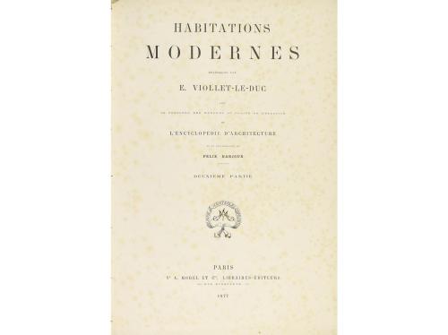 1877. LIBRO. (ARTE- ARQUITECTURA). HABITATIONS MODERNES RECUEILLES PAR... Paris: Ve. A. Morel et cie., 1877. Folio mayor. 4 h. + 28 p. + 200 lám. Puntos de óxido. Enc. en guáflex, cajo parcialmente sesgado. Esta obra es clave en la arquitectura moderna para explicar la transición del historicismo al estilo funcional. Tuvo una gran influencia en arquitectos como Le Corbusier. Recoge 200 láminas con planos, vistas y textos explicativos de los aspectos funcionales y estéticos de los edificios.