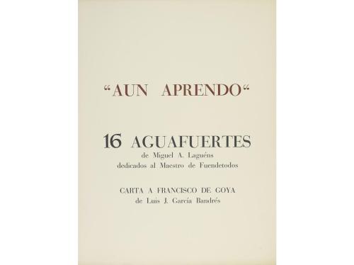 1981. LIBRO. (BIBLIOFILIA-ARTE). "AUN APRENDO". 16 AGUAFUERTES DE ... DEDICADOS AL MAESTRO DE FUENTEDETODOS. CARTA A FRANCISCO DE GOYA DE LUIS J. GARCÍA BANDRÉS. Barcelona: tórculos de Jorge Sánchez y Jaime Coscolla, 1981. Folio. 6 h. para portada y texto. 16 aguafuertes en planchas de 12,5 x10 cm. En rama, con funda, algo sucia. Edición original en un tiraje único de 50 ejemplares sobre papel Creyse de L. Guarro Casas, los grabados han sido estampados en los tórculos de Jorge Sánchez y Jaime Coscolla. Preciosos aguafuertes que representan rostros de tipos y animales basados en la simbología goyesca de un estilo preciosista. Tirada muy corta , pero este ejemplar es Prueba de Autor (marcados PA y firmados a lápiz por Laguéns), fuera de tirada.