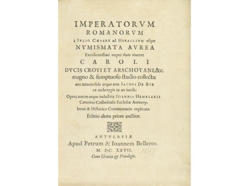 1627. LIBRO. (NUMISMÁTICA). IMPERATORUM ROMANORUM À IULIO CAESARE AD HERACLIUM USQUE NUMISMATA AUREA... Antuerpiae: Apud Petrum & Ioannem Belleros, 1627. 4º menor. Frontis grabado + 15 h. + 247 p. + 64 lám. Capitales historiadas xilográficas. Enc. en plena piel, nervios, tejuelo, hilos dorados, cortes pintados, firmada G. M. Descripción de la colección de monedas del imperio romano del duque Carlos III de Croy Aeschot, de los Países Bajos.