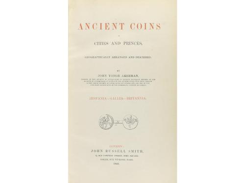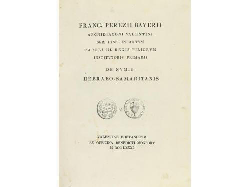 1791. LIBRO. (NUMISMÁTICA). DE NUMIS HEBRAEO-SAMARITANIS. Valentiae: Ex Officina Benedicti Monfort, 1781. 4º mayor. 7 h . (de 8) + 245 p. + XXI p.+ 6 h. Ilustr. con cabeceras, medallas y culs-de-lampe grabados. Leve cerco de humedad en el margen inferior. Enc. del s. XIX en media piel. Muy bella impresión de la imprenta Monfort, una de las más nítidas según Palau, tirada en buen y grueso papel de hilo. CCPB 490215-7. Palau 219818.