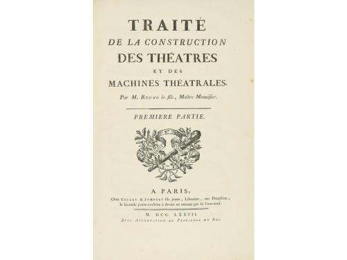 1777. LIBRO. (ARQUITECTURA-TEATRO). TRAITÉ DE LA CONSTRUCTION DES THÉATRES ET DES MACHINES THÉATRALES. Paris: Chez Cellot & Jombert, 1777. Folio mayor. 2 h. + 67 p. + X lám. grabadas, varias plegadas. Texto a dos columnas. Algún punto de óxido. Aunque indica que es primera parte, es la única publicada. Enc. en tela reciente, cortes pintados. Gran papel, grueso, de calidad, todas las láminas calcográficas y realizadas por el autor. La segunda parte estaba preparada pero no se llegó a imprimir nunca y estaba dedicada a las máquinas teatrales. Esta primera parte se dedica la construcción de los teatros.