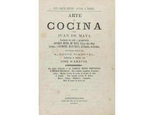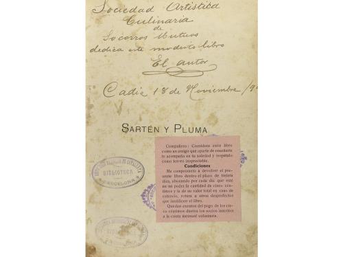 1903. LIBRO. (COCINA). SARTÉN Y PLUMA. APUNTES SOBRE LA COCINA EN LOS BUQUES TRASATLÁNTICOS SEGUIDOS DE LA DESCRIPCIÓN DE LOS PALACIOS FLOTANTES Y DE UNA GUÍA INTERNACIONAL DE LOS SERVICIOS DE FONDAS DE LAS GRANDES EMPRESAS. Cádiz: Lit. y Tip. de F. Rodríguez de Silva, 1903. 4º menor. XI + 771 p. Profus. ilustr. con fotografías en el texto y fuera de texto. Con una dedicatoria del autor a la sociedad Artística culinaria de socorro mutuo en la portadilla. Restauraciones marginales. Varios sellos de caucho en la portada. Enc. en tela reciente, tejuelo. Además de contener más de 1500 recetas, describe el mobiliario y decoración de los grandes buques trasatlánticos de principios del s. XX.
