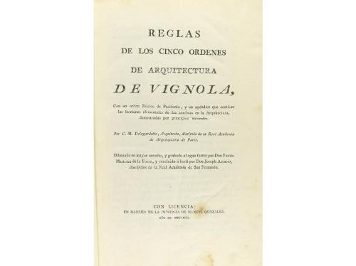 1792. LIBRO. (ARTE-ARQUITECTURA). REGLAS DE LOS CINCO ÓRDENES DE ARQUITECTURA. Madrid: Imp. Manuel Gonzalez, 1792. 4º mayor. Frontis grabado + 3 h. + 21 p. + 44 lám. + 1 plegada + (APÉNDICE) de p. 23 a 42 p. + 21 lám. y 1 plegada. Los grabados al aguafuerte y buril dibujados y grabados por Fausto Martínez de la Torre y Joseph Asensio. Enc. en media piel, rozada, planos de cartoné.