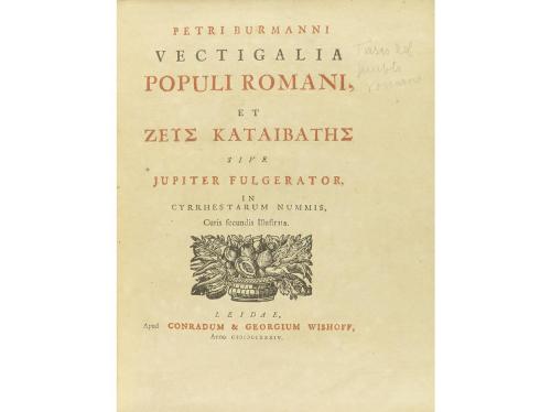 1734. LIBRO. (NUMISMÁTICA). VECTIGAGLIA POPULI ROMANI, ET ZERE KATAIBATHE. Leidae: Conradum & Georgium Wishoff, 1734. Frontis grabado + portada a dos tintas + 12 h. + 346 p. + 5 h. Papel tostado. Enc. en pergamino rígido de época, nervios, puntas y parte inferior de la lomera deterioradas.
