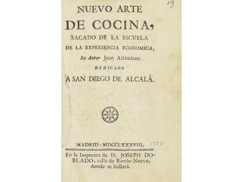 1732. LIBRO. (COCINA-LOTE)). ARTE DE COCINA , PASTELERIA, VIZCOCHERIA, Y CONSERVERIA. Barcelona: Joseph Cormellas, 1732. 8º menor .4 h. + 463 p. + 8 h. Enc. en plena piel, nervios, tejuelo. [Más:] ALTIMIRAS, JUAN: NUEVO ARTE DE COCINA, SACADO DE LA ESCUELA DE LA EXPERIENCIA ECONOMICA. Madrid: Imp. Joseph Doblado, 1788. 8º menor. XXX + 152 p. + 1 lám. Enc. en pergamino.