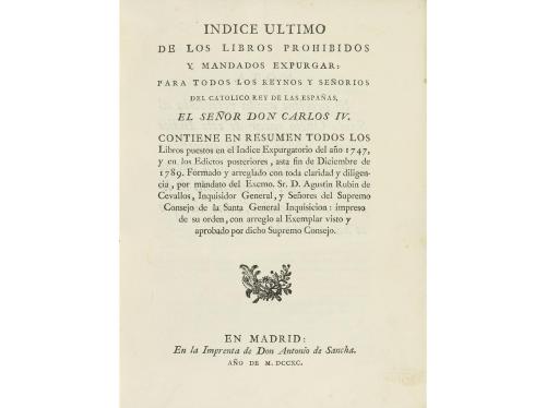 1790. LIBRO. (BIBLIOGRAFÍA). INDICE ULTIMO DE LOS LIBROS PROHIBIDOS Y MANDADOS EXPURGAR; PARA TODOS LOS REYNOS Y SEÑORIOS DEL CATOLICO REY DE LAS ESPAÑAS EL SEÑOR DON CARLOS IV. Madrid: Imprenta Antonio de Sancha, 1790. 4º menor. 2 h. + XL + 305 p. A dos columnas. Señal de óxido y algún cerco de humedad. Enc. en pergamino rígido de época.