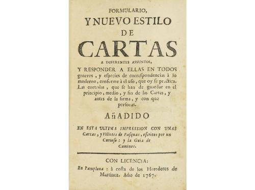 1767. LIBRO. (BIBLIOGRAFÍA). FORMULARIO, Y NUEVO ESTILO DE CARTAS A DIFERENTES ASSUNTOS, Y RESPONDER A ELLAS EN TODOS GENEROS, Y ESPECIES... Pamplona: Herederos de Martinez, 1767. 8º menor. 4 h. +198 p. [Sigue:] GUIA DE CAMINOS PARA IR, Y VENIR POR TODAS LAS PRIVINCIAS DE ESPAÑA. Y PARA IR A ROMA, PARTIENDO DE BARCELONA POR EL CAMINO MAS BREVE, QUE SE HALLA. Sigue la paginación hasta 284. Enc. en pergamino de época.