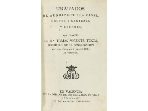 1794. LIBRO. (ARQUITECTURA). TRATADOS DE ARQUITECTURA CIVIL, MONTEA Y CANTERIA, Y RELOXES. Valencia: Oficina de los hermanos de Orga, 1794. 8º menor. 1 h. + 261 p. + 252 p. y 35 lám. plegadas. Galerías a lo largo de la obra, restauradas, no afectan caja de texto. Enc. en pasta española, moderna, tejuelo.