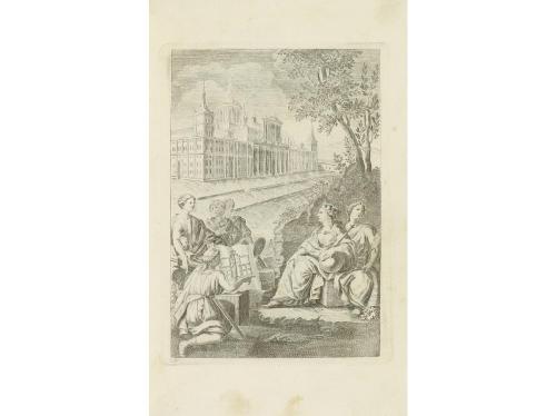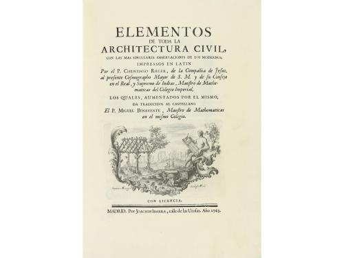 1763. LIBRO. (ARQUITECTURA). ELEMENTOS DE TODA LA ARCHITECTURA CIVIL, CON LAS MAS INGULARES OBSERVACIONES DE LOS MODERNOS, IMPRESSOS EN LATIN... Madrid: por Joachin Ibarra, 1763. 4º mayor. 10 p. + 304 p. + 8 h. + 21 láminas grabadas, algunas plegadas, firmadas "Andres Fernandez Pensionado lo dibuxa, Joannes Minguet Sculpt Matti" sobre arquitectura. Grabado en portada, viñetas y cul-de-lampe calcográficos firmados por: "Joanne Minguet Sculpt Matti y Is Ferdinands â Palomino ft". Buen ejemplar, papel limpio y marginoso. Enc. en pergamino de épocca. Tejuelo. CCPB 64346-7 .