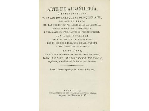 1827. LIBRO. (ARQUITECTURA). ARTE DE ALBAÑILERIA, Ó INSTRUCCIONES PARA LOS JÓVENES QUE SE DEDIQUEN Á ÉL, EN QUE SE TRATA DE LAS HERRAMIENTAS NECESARIAS AL ALBAÑIL, FORMACION DE ANDAMIOS... Madrid: Oficina de Francisco Martinez Dávila, 1827. 8º mayor. 88 p. + 1 h. + 10 lám. grabadas por Juan de Villanueva, varias plegadas. Enc. en plena piel, hierros secos en ambos planos, cortes jaspeados, algo rozada.