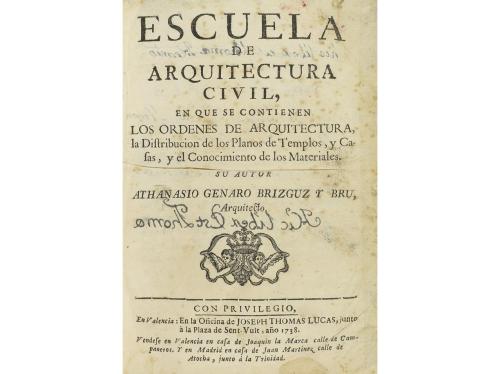 1738. LIBRO. (ARQUITECTURA). ESCUELA DE ARQUITECTURA CIVIL, EN QUE SE CONTIENEN LOS ORDENES DE ARQUITECTURA, LA DISTRIBUCION DE LOS PLANOS DE TEMPLOS, Y CASAS, Y EL CONOCIMIENTO DE LOS MATERIALES. Valencia: Imp. Joseph Thomas Lucas, 1738. 8º. 12 h. + 159 p. + 54 lám. grabadas, muchas de ellas plegadas. Señal de óxido y algún cerco de humedad. Enc. por Domenech en media piel reciente, corte superior dorado. Anotaciones manuscritas de antiguo poseedor. Palau 36422.