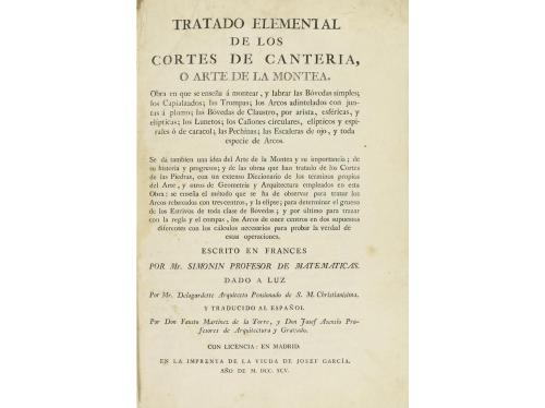 1795. LIBRO. (ARQUITECTURA-CONSTRUCCIÓN). RATADO ELEMENTAL DE LOS CORTES DE CANTERIA, O ARTE DE LA MONTEA. Obra en que se enseña á montear, y labrar las Bóvedas simples; los Capialzados; las Trompas; los Arcos adintelados ... : Se dá tambien. Madrid: en la imprenta de la Viuda de Josef García, 1795. Folio menor. 3 h. + 64 p. 49 láminas, varias plegadas. Finas galerías marginales, leve señal de humedad. Enc. en pasta española , tejuelo, cortes pintados. CCPB 310990-9.