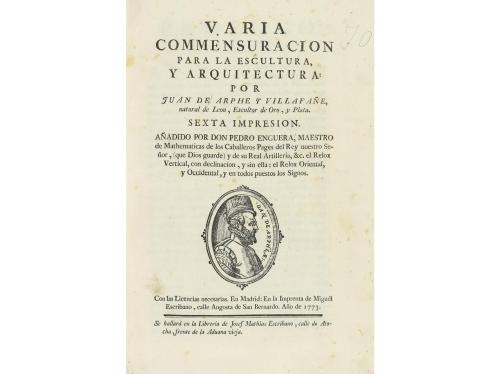1773. LIBRO. (ARQUITECTURA). VARIA COMMESURACION PARA LA ESCULTURA, Y ARQUITECTURA. Madrid: Imp. de Miguel Escribano, 1773. 4º mayor. 2 h. + 298 p. Profus. ilustr. con xilografías en el texto. Enc. en pergamino de época. Esta 6ª edición lleva añadido el tratado de Pedro Enguera sobre relojes. Palau 16058.