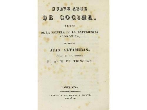1822. LIBRO. (COCINA). NUEVO ARTE DE COCINA, SACADO DE LA ESCUELA DE EXPERIENCIA ECONÓMICA... AÑADIDO EN ESTA IMPRESION EL ARTE DE TRINCHAR. Barcelona: Imp. Sierra y Martí, 1822. 8º menor. 176 p. Puntos de óxido. Enc. en medio pergamino, planos de cartoné papel al agua.