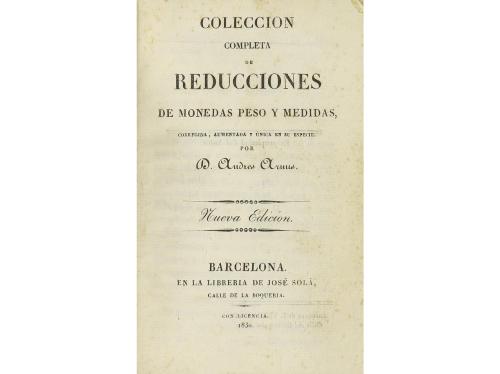 1765. LIBRO. (MONEDAS). CORRESPONDENCIA DE LA MONEDA DE CATALUÑA À LA DE CASTILLA. Y LA DE CASTILLA À LA DE CATALUÑA. REGULADA POR EL DOBLON DE 70. RS. DE ARDS, À 75. RS. Y 10 MRS... AÑADIDA EN ESTA ULTIMA IMPRESION, À MAS D. Barcelona: Por Thomas Piferrer Impresor del Rey N. Sr. Plaza del Angel, 1765. 12º, estrecho. 61 hojas sin numerar. Enc. en pergamino tipo cartera. Palau 62720. [Más:] ARNUS, ANDRES: COLECCION COMPLETA DE REDUCCIONES DE MONEDAS PESO Y MEDIDAS, CORREGIDA Y ÚNICA EN SU ESPECIE. Barcelona: Libr. José Solá, 1830. 8º menor. VI + 80 p. [Sigue:] NUEVA REDUCCIÓN... Id.20 p. + 1 h. Enc. en pasta española, cortes pintados.