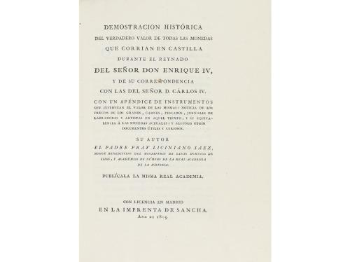 1805. LIBRO. (NUMISMÁTICA). DEMOSTRACION HISTORICA DEL VERDADERO VALOR DE TODAS LAS MONEDAS QUE CORRIAN EN CASTILLA DURANTE EL REYNADO DEL SEÑOR DON ENRIQUE IV, Y DE SU CORRESPONDENCIA CON LAS DEL SEÑOR D. CARLOS IV. Madrid: en la Imprenta de Sancha, 1805. 4º. XX + 580 p.+ 1 h. 3 láminas de grabados, una plegada. Con las barbas. Enc. en media piel reciente, tejuelo, nervios.