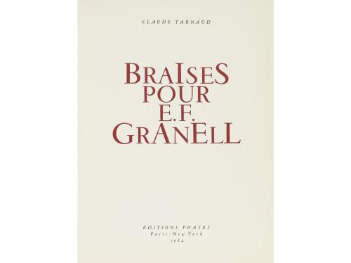 1964. LIBRO. (ARTE-BIBLIOFILIA). BRAISES POUR E. F. GRANELL. Paris-New York: Ed. Phases, 1964. 4º. Con 5 litografías en negro a toda plana y una doble. En rama, con la rústica original a dos tintas, que reproduce una ilustración de Granell. Ejemplar de los X reservados a los colaboradores marcado H/C, de un total de 300 ejemplares. Incluye además el tarjetón de invitación a la exposición dedicada a Granell celebrada en la Bodley Gallery entre octubre y noviembre de 1961.