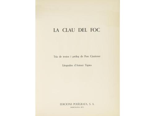 1973. LIBRO. (ARTE). LA CLAU DEL FOC. Barcelona: Polígrafa, 1973. Folio. 82 p.+ 2 h. Ilustrado. Enc. tela editorial decorada, con portada en relieve de Tàpies. Ejemplar de los 75 numerados que contienen las 16 litogarafías originales sobre papel Guarro y firmado por Tàpies, de un total de 500.