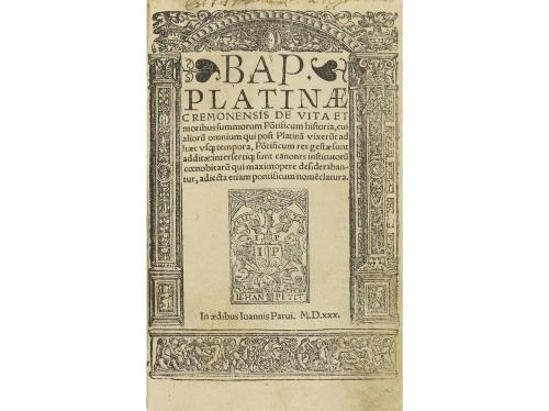 1530. LIBRO. (BIOGRAFÍAS). DE VITA ET MORIBUS SUMMORUM PO[N]TIFICUM HISTORIA, CUI ALIORU[M] OMNIUM QUI POST PLATINA[M] VIXERU[N]T AD HAEC USQ[UE] TEMPORA... [Paris:] Iehan Petit (Ioannis Parvi), 1530. 8º menor. CCCLXVIII fol. 4 h. Portada en orla xilográfica, con tachadura de antiguo propietario. Enc. en media piel, planos de cartoné, cortes pintados, del s. XIX.