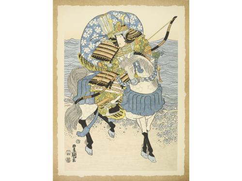1976. LIBRO. (ARTE JAPONÉS). LAS XILOGRAFIAS DE TOYOKUNI CON RETRATOS Y ESCENAS DEL TEATRO CLASICO JAPONES. Madrid: División de bibliofilia de Editorial Offo, 1976. Gran folio. 12 h. + 12 xilografías a todo color. En rama, presentado en funda y petaca de seda estampadas. La petaca algo sucia. Edición numerada y limitada a 298 ejemplares firmados por el editor.
