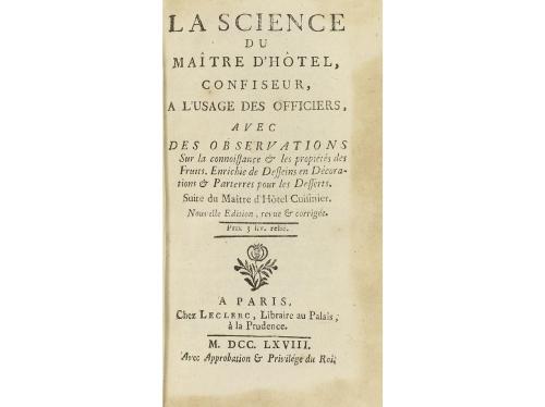 1768. LIBRO. (COCINA-GASTRONOMÍAQ). LA SCIENCE DU MAÎTRE D'HÔTEL, CONFISEUR, A L'USAGE DES OFFICIERS, AVEC DES OBSERVATIONS SU LA CONNOISSANCE & LES PROPIÉTÉS DES FRUITS... Paris: Chez Leclerc, 1768. 8º menor. 1 h. + III p. + 1 h. + 525 p. + 13 h. + 5 lám. plegadas, algunas con rasgadura pero sin pérdida. Enc. en pasta española, tejuelo, cortes pintados. Menon vuelca en esta obra todo su conocimiento sobre repostería y confitería, saber en que era un experto. Las láminas muestran decoraciones de mesas y distribución de diferente número de comensales.