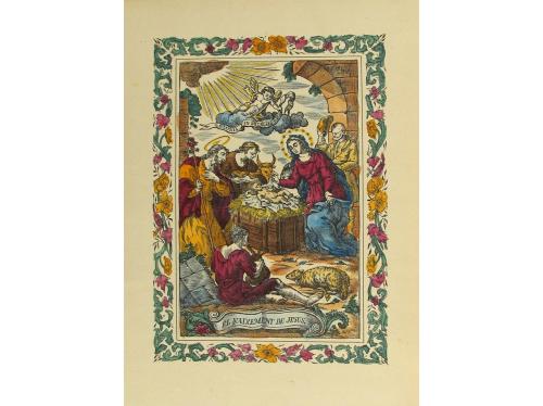 1945 ca. LIBRO. (BIBLIOFILIA). AMADES, JOAN:. EL PESSEBRE. Barcelona: Les Belles edicions, s.a. Folio mayor. 375 p., 1 h. Ilustr. en texto + 4 lám. Cabeceras y capitales coloreadas a mano. Enc. en tela edit. con lomera y plano anterior estampado, ligeramente deslucida, bonitas hojas de guarda. Ejemplar numerado del tiraje sobre papel de hilo de 480 ejemplares.