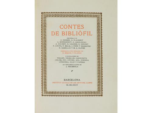 1924. LIBRO. (BIBLIOFILIA). MIQUEL Y PLANAS, R.:. CONTES DE BIBLIÒFIL. Precedits d´un pròleg de Miquel y Planas. Barcelona: Ed. Institut Catalá de les Arts del Llibre, 1924. 4º menor. XLIII p. + 359 p., 4 h. Texto en orla tipográfica. Ilustr. con 40 grabados de TRIADO, URGELLES, CARDUNETS, COLOM, PEY, D´IVORI, APA, JUNCEDA, LONGORIA, OLLE y PAHISSA. Leve sombra de óxido. Rústica editorial estampada. Edición numerada y limitada a 350 ejemplares en papel de hilo, intonso.