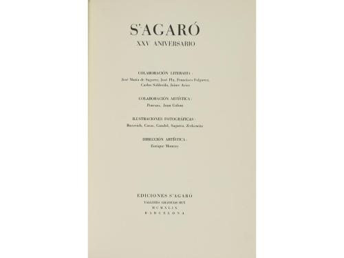 1949. LIBRO. (BIBLIOFILIA). S'AGARÓ XXV ANIVERSARO. Colaboración literaria de José María de Sagarra, José Pla, Francisco Folguera, Carlos Soldevila, Jaime Arias. Barcelona: Ediciones s'Agaró, 1949. Folio menor. 117 p. + 2 h. Profus. ilustr. con fotografías en b/n en el texto, por Bucovich, Casas, Gandol, Sagarra y Zerkowitz. La ilustración de la cubierta es de Joan Colom. Ejemplar enriquecido con la firma de algunos de los colaboradores, como Arias. Enc. firmada por BRUGALLA en chagrin verde, hilos cantos, y cejas dorados, nervios, lomera cuajada, cortes dorados, con escudo en mosaico de pieles en el plano anterior, presentado en una petaca con perfiles de piel, conserva las cubiertas originales.