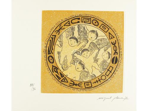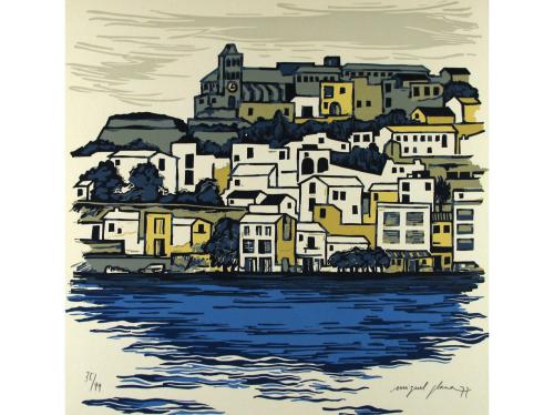 1976. LIBRO. (BIBLIOFILIA). MARI, ISIDOR; PLANA, MIQUEL [ILUSTRADOR]:. EIVISSA ARDENCIA DE LLUM PRESA. Pròleg i selecció de textos a cura d`Isidor Marí. Olot: Ed. Miquel Plana, 1976. Folio mayor cuadrado. 18 p. Ilustr. con 10 linóleums a color firmados a mano y numerados de MIQUEL PLANA. Ejemplar en rama presentado en una carpeta en cartoné y un estuche en el mismo material y pintado. Edición numerada de 99 ejemplares.
