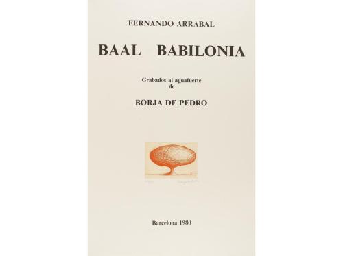 1980. LIBRO. (BIBLIOFILIA). ARRABAL, FERNANDO:. BAAL BABILONIA. GRABADOS AL AGUAFUERTE POR BORJA DE PEDRO. Barcelona: imp. Grafos, 1979. Folio mayor. 40 h. Ilustr. con 11 aguafuertes. Ejemplar en rama, presentado en rama, funda de tela y estuche de cartoné papel al agua, rozado. Edición numerada de 95 ejemplares en papel Alfa. Todos los grabados numerados y firmados a lápiz por el autor.
