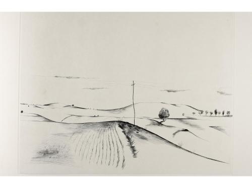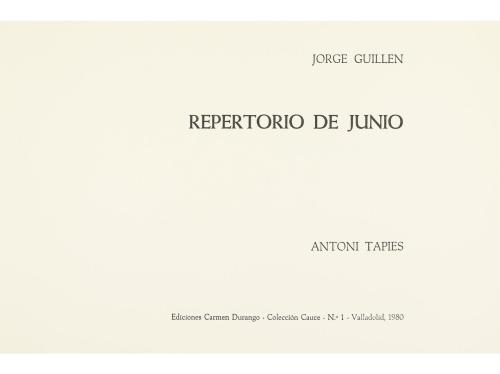 1980. LIBRO. (BIBLIOFILIA-ARTE). GUILLEN, JORGE:. REPERTORIO DE JUNIO. Valladolid: Ediciones Carmen Durango, 1980. Folio mayor apaisado. Edición ilustrada con 6 grabados al aguafuerte originales de Antoni Tàpies. En rama, presentado en funda y caja de tela edit. estampada. Ejemplar de la tirada de 10 numerados en romanos que debería llevar una suite aparte de los grabados, no la conserva. Lleva la firma de los dos artistas.