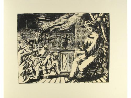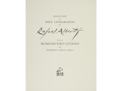 1977. GRABADO. (BIBLIOFILIA). GARCIA LORCA, FEDERICO; ALBERTI, RAFAEL:. SELECCIÓN DE DIEZ LITOGRAFÍAS DE... PARA EL ROMANCERO GITANO. [Madrid-Barcelona: Filigrana, Sociedad Anónima de Ediciones limitadas en los tall. Altamira, 1977.] Una carpeta que contiene una selección de diez litografías y un apunte de Rafael Alberti. Edición limitada a 50 ejemplares. En rama presentado en una carpeta de guáflex estampado.