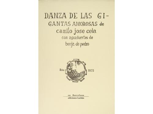 1975. LIBRO. (BIBLIOFILIA). CELA, CAMILO JOSE; PEDRO, BORJA DE:. DANZA DE LAS GIGANTAS AMOROSAS... CON AGUAFUERTES DE BORJA DE PEDRO. Barcelona: Eds. Luchán, 1975. Gran folio. 6 h. Ilustr. con 8 aguafuertes. En rama, sin funda ni petaca. Edición numerada de 75 ejemplares firmados por CELA y DE PEDRO.
