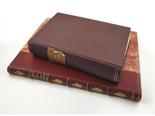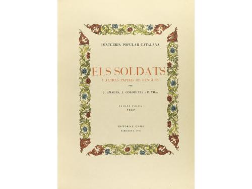 1936. LIBRO. (BIBLIOFILIA-PAPEL JAPÓN). AMADES, J.; COLOMINAS, J.; VILA, P.:. ELS SOLDATS I ALTRES PAPERS DE RENGLES. Barcelona: Ed. Orbis, 1936. 2 vol. En folio menor. I: 216 p. + XLVIII p. con un catálogo adicional. II: Contiene los facímiles a todo color, en C láminas litográficas numeradas + 2 h., una de ellas de tabla. Dos vol. enc. en pergamino rígido, corte superior dorado, con sobrecubierta y presentados en petacas de cartoné. Ejemplar de los XX numerados en romanos y sobre papel japón.