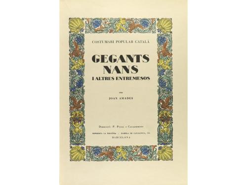 1934. LIBRO. (BIBLIOFILIA-PAPEL JAPÓN). AMADES, JOAN:. GEGANTS I NANS. Barcelona: Ed. Pujol-La Neotipia, 1934. Folio. 227 pág. + 1 h. Ilustrado con 87 láminas en negro y coloreadas sobre papel Japón. Enc. en pergamino rígido, presentado en petaca de cartoné. Ejemplar de los XX numerados en romanos y sobre papel japón.