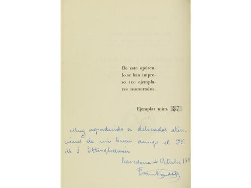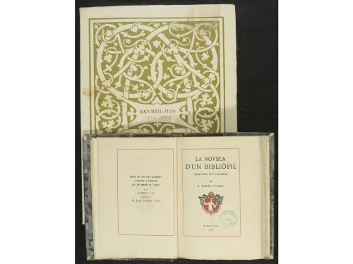 1918-1951. LIBRO. (BIBLIOGRAFÍA). HOMENAJE A LA MEMORIA DEL ILUSTRÍSIMO SEÑOR D. RAMON MIQUEL Y PLANAS. ORGANIZADO POR LA ASOCIACIÓN DE BIBLIÓFILOS DE BARCELONA; LA REAL ACADEMIA CATALANA DE BELLAS ARTES DE SAN JORGE; GREMIO SINDICAL. Barcelona: Imprenta Altés, 1952. 4º. 113 p.+ 3 h. Ilustraciones en color. En rústica edit. estampada. Tirada de 200 ejemplares numerados. Marcas de lápiz. Contiene textos de: Marqués de Mura; Luis Faurado de Saint-Germain; Martín de Riquer; José Porter; Luis Masriera; Antonio Ollé Pinell; Arcadio de Bobes Balaguer; José Rodergas Calmell. [Más:] MIQUEL Y PLANAS, R.: LA NOVELA D'UN BIBLIÒFIL (DIÀLEGS DE LLIBRES). Barcelona: Tip. L'Avenç., 1918. 8º menor. 158 p., 1 h. Edición de 120 ejemplares en papel de hilo numerados y nominados para amigos del autor. Enc. en media piel, lomera algo rozada.