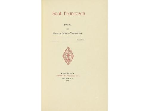 1904. LIBRO. (BIBLIOFILIA). VERDAGUER, JACINTO:. SANT FRANCESCH. POEMA PER... Barcelona: Tip. La Catalana, 1904. 8º mayor. 164 p. Enc. en plena piel, nervios, cortes dorados, conserva las cubiertas originales. Edición sobre papel japón .