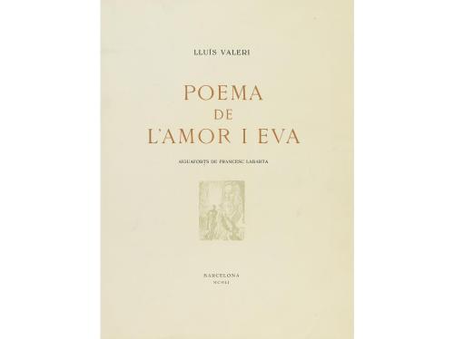 1951. LIBRO. (BIBLIOFILIA). VALERI, LLUIS:. POEMA DE L´AMOR I EVA. Barcelona: Imprenta Altés, 1951. 4º mayor. 32 p.+ 1 h. Cubiertas originales con estuche. Ilustrado con siete aguafuertes de Francesc Labarta, fuera de texto. Perfecto estado. Bella edición limitada y numerada de 188 ejemplares en papel de hilo.