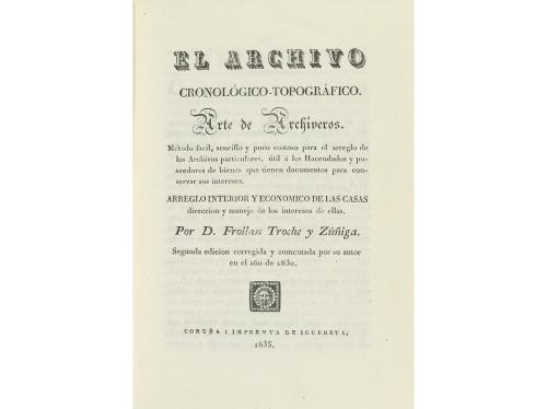 1835. LIBRO. (BIBLIOGRAFÍA). TROCHE Y ZÚÑIGA, FROILAN:. EL ARCHIVO CRONOLÓGICO-TOPOGRÁFICO. ARTE DE ARCHIVEROS. Coruña: Imp. De Iguereta, 1835. 8º mayor. XII + 235 p. + 5 estados plegados, fuera del texto. Enc. en plena piel, tejuelo .