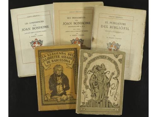 1918-1928. LIBRO. (BIBLIOFILIA-CONJUNTO). MIQUEL Y PLANAS, R.:. CINCO OBRAS EN CATALÁN PUBLICADAS POR... Los títulos que integran este lote son: LES CONFIDENCIES D'EN JOAN BONHOME (1918), ELS PENSAMENTS D'EN JOAN BONHOME (1919), EL PURGATORI DEL BIBLIÒFIL (1920), ELS CENT AFORISMES DEL BIBLIOFIL (1924), LA LLEGENDA DEL LLIBRETER ASSASSÍ DE BARCELONA (1928). Todos 12º y 8º menor, en rústica editorial y bien conservados, salvo alguno con sombra de óxido. Ediciones numeradas sobre papel de hilo.