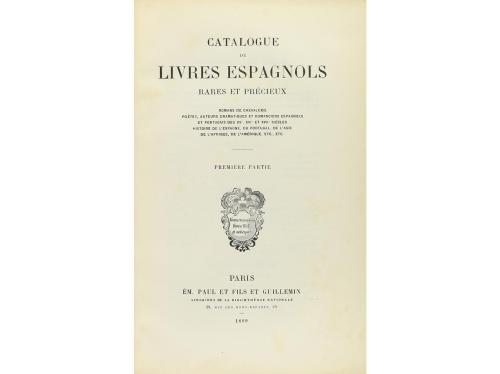 1899. LIBRO. (BIBLIOGRAFÍA). CATALOGUE DE LIVRES ESPAGNOLS RARES ET PRÉCIEUX. Romans de chevalerie, poètes, auteurs dramatiques... Paris: Em. Paul et fils et Guillemin, 1899. 4º menor. 172 p. + 64 p. + 4 p. Dos partes enc. juntas en un vol. en tela reciente, tejuelo, conservas las cubiertas originales, laminadas. Ex-libris.