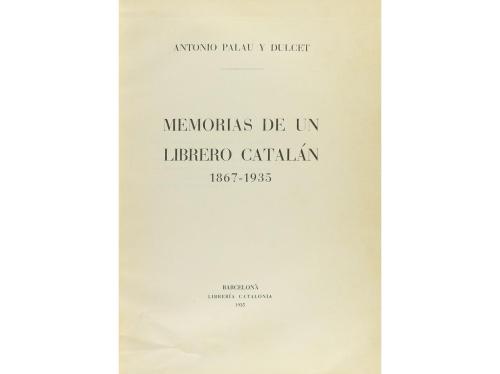 1935. LIBRO. (BIBLIOGRAFÍA). PALAU Y DULCET, ANTONIO:. MEMORIAS DE UN LIBRERO CATALAN, 1867-1935. Barcelona: Librería Catalonia, 1935. 4º menor. 2 h. + 598 p.+ 1 h. Retrato del autor. Enc. en media piel, conserva las cubiertas originales. Edición original en lengua castellana del considerado ´bestseller´ de las memorias de libreros anticuarios. Extraordinaria fuente de información sobre libros, bibliotecas y libreros de los cincuenta años anteriores a la guerra civil. Se tiraron 1000 ejemplares.