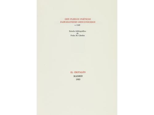 1983. LIBRO. (BIBLIOFILIA-PLIEGOS POÉTICOS). CÁTEDRA, PEDRO M.:. SEIS PLIEGOS POÉTICOS BARCELONESES DESCONOCIDOS C. 1540. Madrid: El Crotalón, 1983. 4º. 71 p. + 28 h., la última blanca. En rama, presentado en funda y carpeta de tela con cintas. Edición numerada y nominada de 324 ejemplares. Ex-libris.