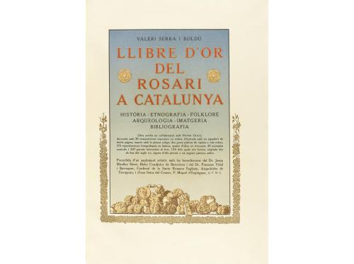 1925. LIBRO. (BIBLIOFILIA). SERRA BOLDÚ, VALERI; OLIVA, VÍCTOR:. LLIBRE D'OR DEL ROSARI A CATALUNYA. HISTÒRIA, ETNOGRAFIA, FOLKLORE, ARQUEOLOGIA, IMATGERIA, BIBLIOGRAFIA. Barcelona: Oliva de Vilanova, 1925. Gran folio. 13 p. + 1 h. + 367 p. + 1 h. Decorada con 20 composiciones expresas en colores, ilustrado con un aguafuerte de doble página, impreso con la plancha antigua, dos grandes plafones de azulejos a ocho colores, 273 reproducciones fotográficas en lámina, cuatro de ellas en tricomía, 49 ejemplos musicales y 307 grabados intercalados en el texto, 158 de los cuales son xilografías originales de finales del siglo XV, algunos de ellos pintados a mano. Enc. en pleno pergamino, con tejuelo rotulado en el plano anterior, corte superior pintado.