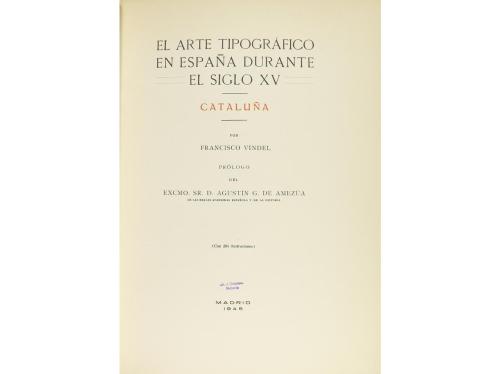 1945. LIBRO. (BIBLIOFILIA). VINDEL, FRANCISCO:. EL ARTE TIPOGRÁFICO EN ESPAÑA DURANTE EL SIGLO XV. CATALUÑA. Prólogo de Agustín G. de Amezúa. Madrid: Talleres tipográficos de Góngora, 1945. Folio menor. XIX + 258 p. Con 264 ilustraciones. Enc. por BUENO en medio pergamino, puntas, nervios, corte superior dorado, conserva las cubiertas originales. Edición numerada de 500 ejemplares.