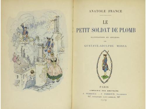 1919. LIBRO. (BIBLIOFILIA). FRANCE, ANATOLE:. LE PETIT SOLDAT DE PLOMB. Paris: A. Ferroud, 1919. 8º menor. 4 h., incluido frontis decorado + 33 p. + 2 h. Ilustr. y coloreados a mano por Gustave-Adolpohe Mossa con cabeceras, capitales e ilustraciones a plena página. Al final lleva una suite con todas las ilustraciones sobre papel china. Edición numerada de 200 ejemplares sobre papel japón. Enc. en media piel, nervios, conserva las cubiertas originales.