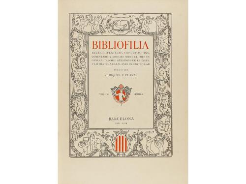 1911-1920. LIBRO. (BIBLIOFILIA). MIQUEL Y PLANAS, RAMON:. BIBLIOFILIA. RECULL D'ESTUDIS, OBSERVACIONS, COMENTARIS Y NOTÍCIES SOBRE LLIBRES EN GENERAL Y SOBRE QÜESTIONS DE LLENGUA Y LITERATURA CATALANES EN PARTICULAR. Barcelona: Fidel Giró, 1911-1921. 2 vol. 4º mayor. I: 5 h. + 670 p. II: 5 h. + 628 p. Ambos profusamente ilustr. 2 vol. enc. en tela editorial con lomo de piel y cubiertas gofradas, cortes jaspeados. Se ocupa de ediciones antiguas catalanas (siglos XV-XVII), reproducen portadas y grabados; también sobre el arte de la encuadernación antigua y moderna, en el primer caso estudia hasta los tipos de hierros que decoran estas raras encuadernaciones, y en las modernas tiene muy bien representada la decoración de tipo modernista. La obra acaba complementándose con una serie de biografías de muchas de las personas que se ocupan del estudio de las obras antiguas así como del mundo de la edición y encuadernación. Palau 171351.
