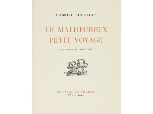 1942. LIBRO. (BIBLIOFILIA). SOULANGE, GABRIEL:. LE MALHEREUREUX PETIT VOYAGE. Paris: Ed. du Charme, 1942. 4º menor. 187 p. + 1 h. Con ilustr. en el texto de Maurice Leroy, a color. Rústica. Edición numerada de 750 ejemplares. En rama y funda, sin la petaca.